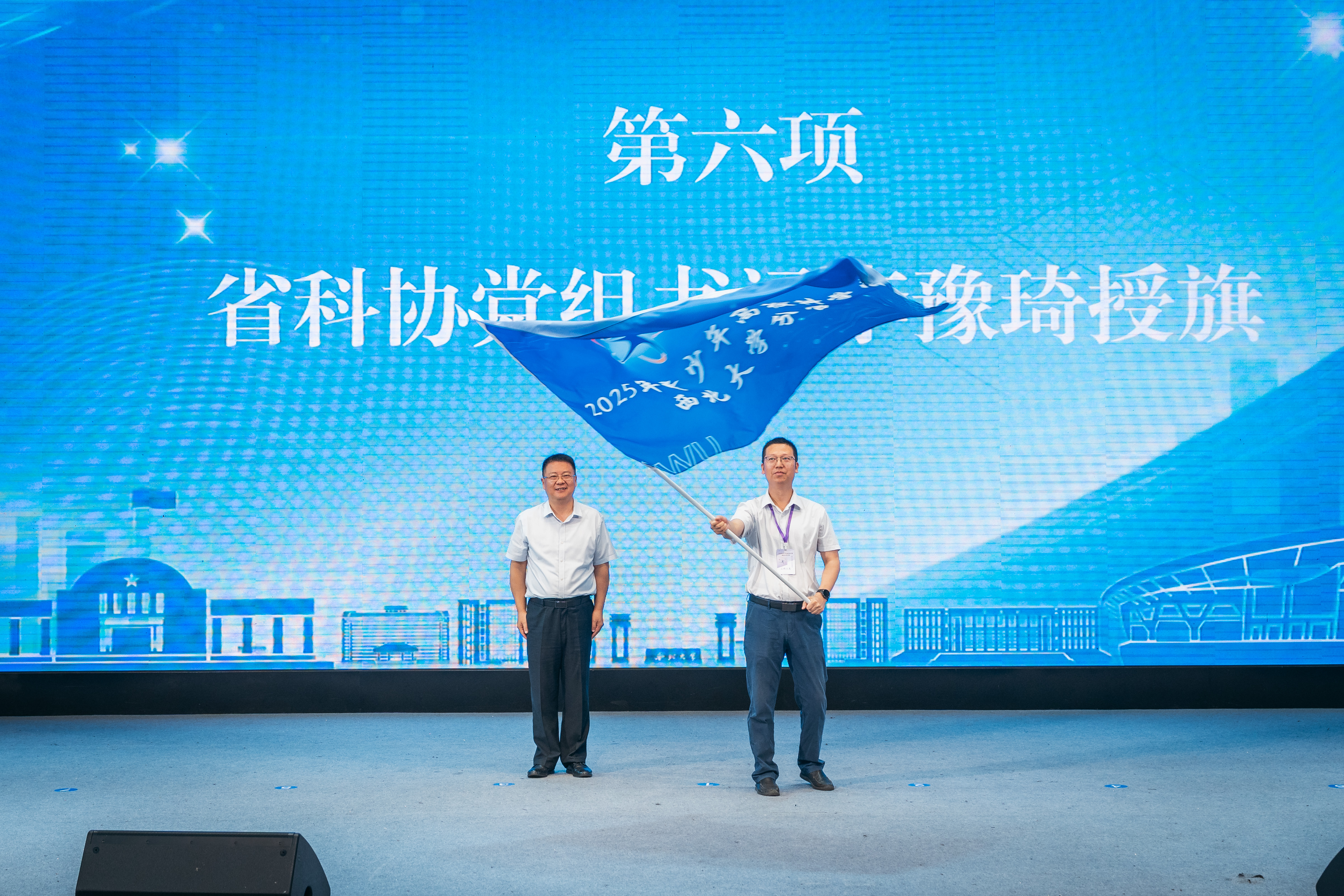 李豫琦为陕西省青少年高校科学营开云在线分营授旗,校团委负责人接旗。