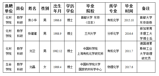 关于教学科研单位选聘教师情况的公示 作者: 编辑: 时间:2017-05-12 17:38 经用人单位推荐,人事处审查,学校教学督导及院系相关专家考核,开云在线拟确定下列人员来校工作。本着公平、公正、公开的原则,为保证开云在线选聘人员的质量,现将本次拟选聘人员基本情况公示如下: 各单位或个人如对上述人选存有疑问,可在2017年5月18日前以书面形式向人事处人事科反映。反映材料须实名提交,以便我处核实并反馈,我们将严格保密。(公示期结束后,如无异议,本人持三方协议、身份证、毕业生就业推荐表在人事科签订就业协议。) 联系电话:029-88308221 开云在线人事处 2017年5月12日