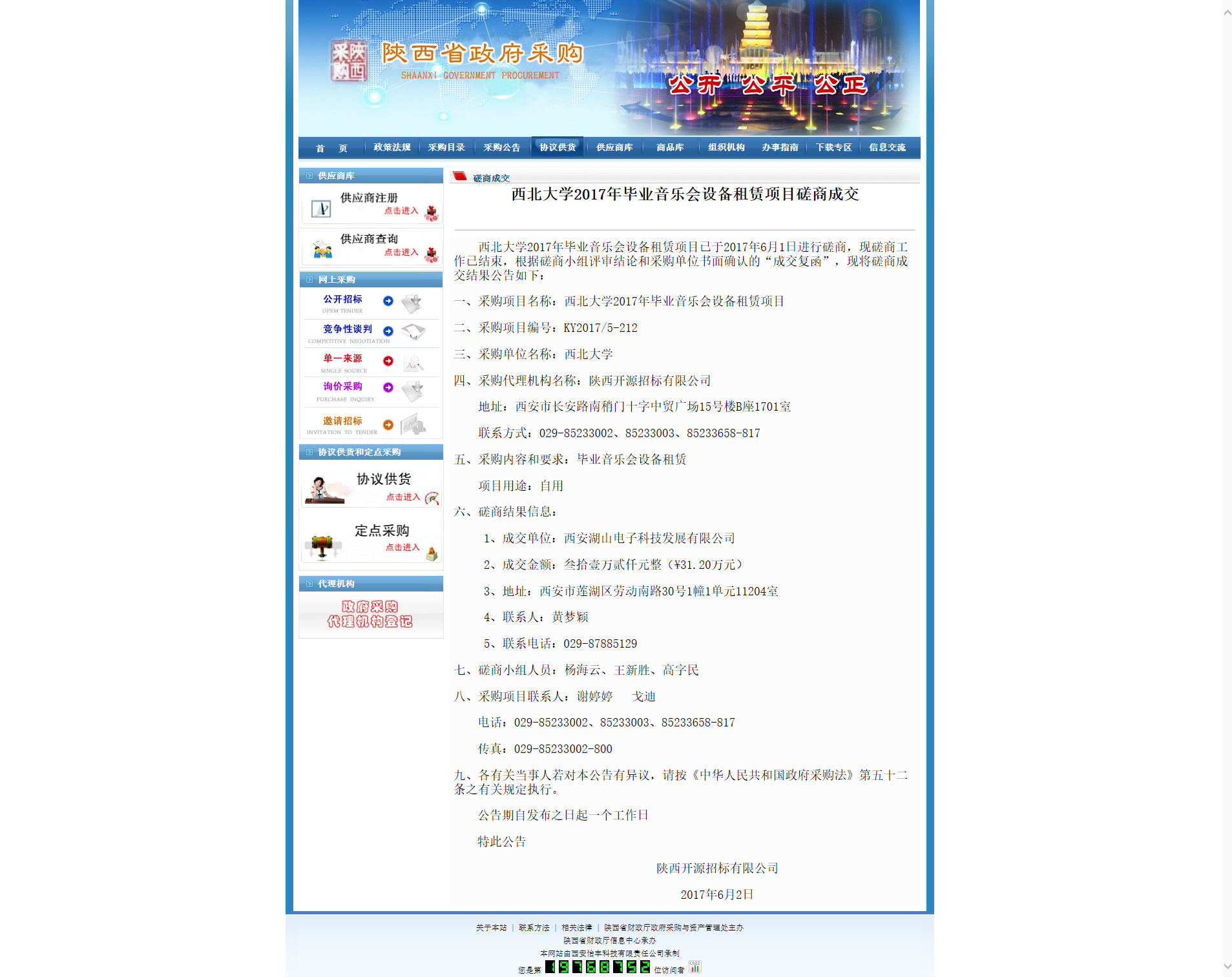 开云在线2017年毕业音乐会设备租赁项目磋商成交 作者: 编辑: 时间:2017-06-05 09:53 http://www.ccgp-shaanxi.gov.cn/zb_view.jsp?NewsID=ZH170602144541US131018031658&ClassBID=CS002