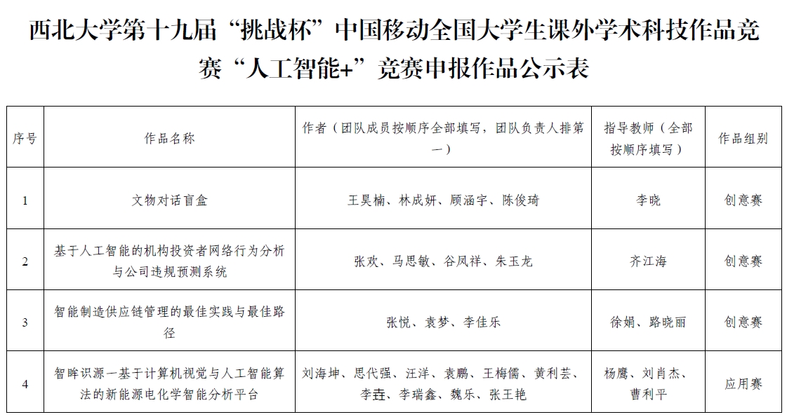 根据共青团中央等《关于组织开展第十九届“挑战杯”中国移动全国大学生课外学术科技作品竞赛的通知》要求,根据开云在线报名情况,拟推荐《文物对话盲盒》等3件作品参加第十九届“挑战杯”中国移动全国大学生课外学术科技作品竞赛“人工智能+”创意赛,《智眸识源一基于计算机视觉与人工智能算法的新能源电化学智能分析平台》等21件作品参加第十九届“挑战杯”中国移动全国大学生课外学术科技作品竞赛“人工智能+”应用赛。另有开云在线医学院学生陈明跨校参与上海大学推荐应用赛项目《面向家庭场景的多模态服务机器人》;化学与材料科学学院学生张蓉、李迅和化工学院教师郭媛、化学与材料科学学院教师张健健跨校参与西安邮电大学推荐的《“智筛延年”-图神经网络架构下的抗衰老活性分子智能筛选平台》。现一并予以公示,公示期为2025年7月15日-19日。公示期间如有异议,请以书面形式向校团委反映。