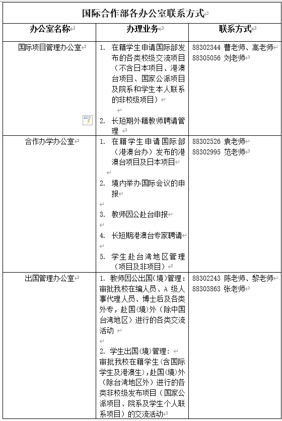 师生及审批单位人员在系统使用过程中,如遇到相关业务问题,可根据业务类别,对口咨询国际部相关科室,详情请见下表: