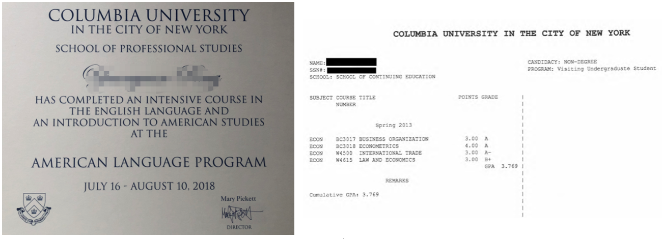 左图:哥大语言文化项目证书样图 右图:哥大专业学分课程成绩单样图
